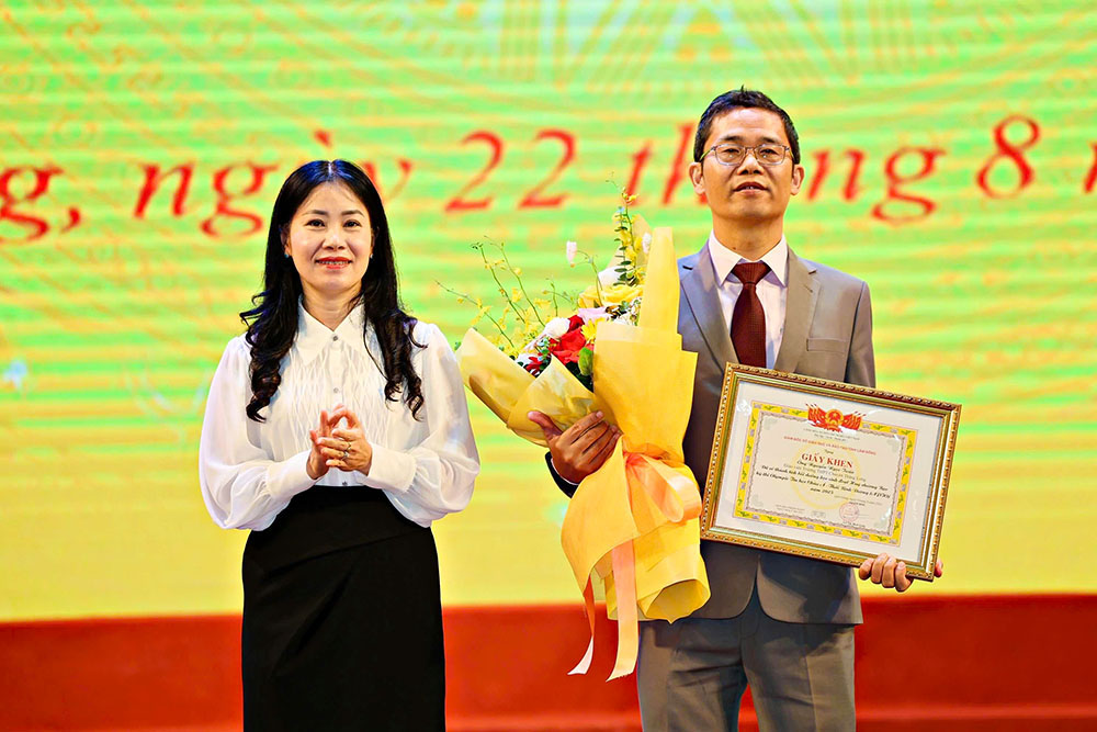 Giám đốc Sở GD&ĐT Lê Thị Bích Liên tặng Giấy khen cho giáo viên tại Hội nghị Tổng kết năm học 2024-2025