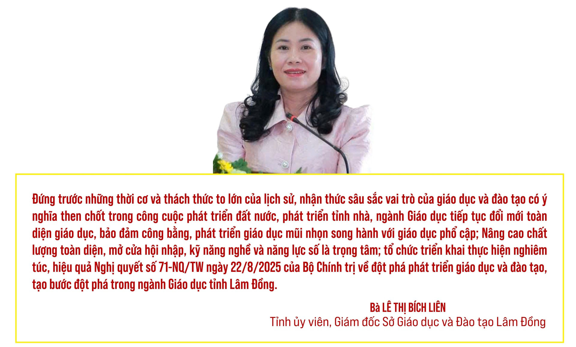 Tiểu sử tóm tắt của người ứng cử Đại biểu HĐND tỉnh Lâm Đồng nhiệm kỳ 2026 – 2031 của đồng chí Lê Thị Bích Liên, UVBCH Đảng bộ tỉnh, Giám đốc Sở GDĐT