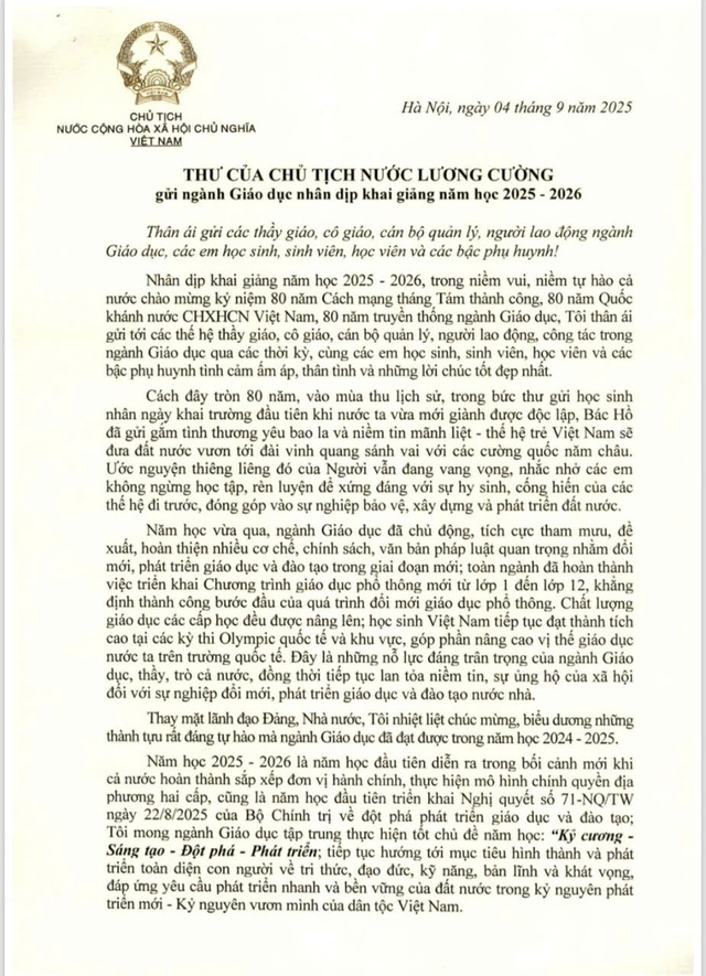 Chủ tịch nước Lương Cường tới dự Lễ khai giảng năm học mới kết hợp kỷ niệm 80 năm thành lập Bộ Quốc gia Giáo dục.