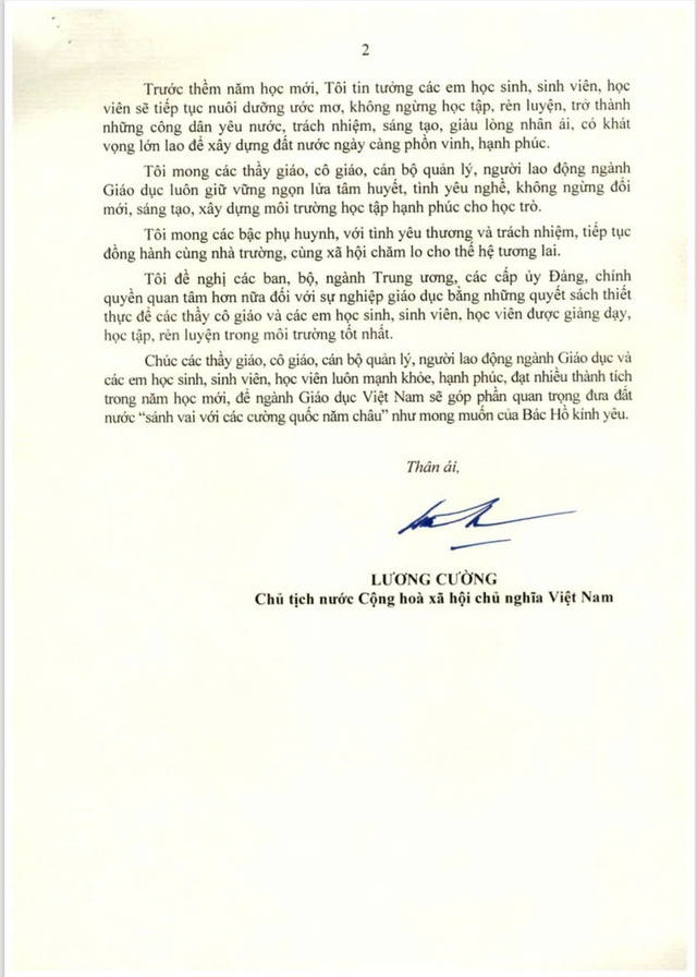 Thay mặt lãnh đạo Đảng, Nhà nước, tôi xin gửi tới các thầy giáo, cô giáo, cán bộ quản lý giáo dục, cùng toàn thể học sinh, sinh viên cả nước lời chào mừng nồng nhiệt, lời chúc mừng tốt đẹp nhất. Chúc ngành giáo dục tiếp tục có những bước phát triển đột phá, xứng đáng với truyền thống hiếu học và khát vọng vươn lên của dân tộc Việt Nam Anh hùng. Chúc mừng Bộ Giáo dục và Đào tạo được tặng thưởng Huân chương Lao động hạng Nhất.