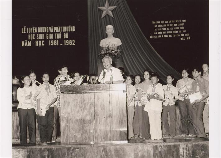 Thủ tướng Phạm Văn Đồng tại lễ tuyên dương và phát thưởng cho học sinh giỏi Thủ đô năm học 1981-1982 (ngày 01/6/1982)