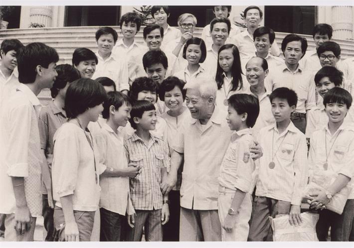 Thủ tướng Phạm Hùng với thầy, cô giáo và các em học sinh trong đoàn dự thi quốc tế tiếng Nga tại Liên Xô, Toán tại Cuba và Vật lí tại CHDC Đức ngày 17/9/1987, tại Phủ Chủ tịch