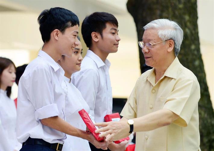 Tổng Bí thư Nguyễn Phú Trọng trao quà cho các học sinh Trường THPT Nguyễn Gia Thiều đạt kết quả cao trong kỳ thi tuyển sinh Đại học năm 2014