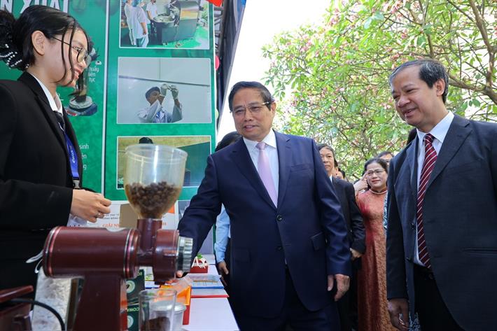 Thủ tướng Phạm Minh Chính và Bộ trưởng Nguyễn Kim Sơn thăm các gian hàng khởi nghiệp của học sinh, sinh viên
